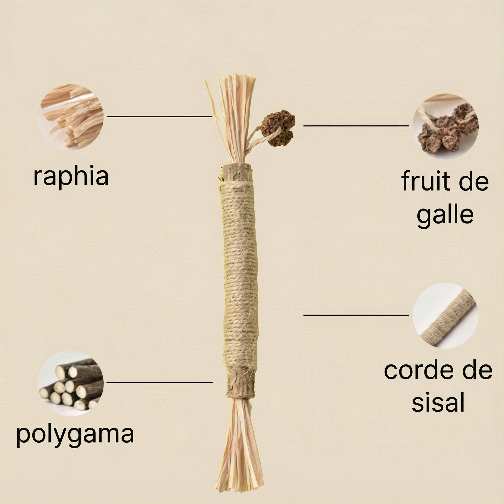 La texture fibreuse du bois de vigne agit comme une brosse naturelle lorsque votre chat mâche.
